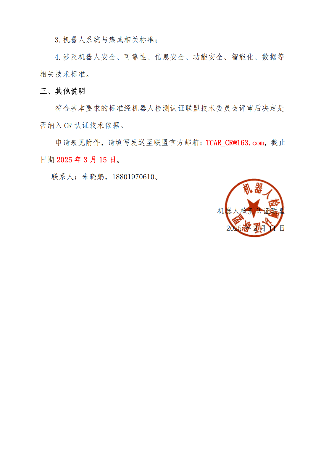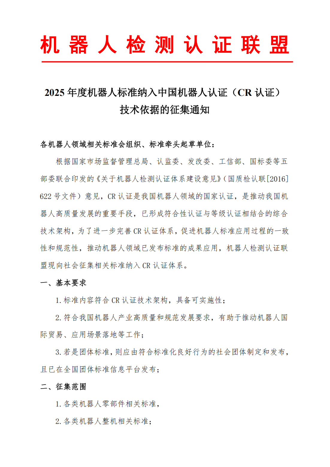 2025 年度机器人标准纳入中国机器人认证(CR认证)技术依据的征集通知