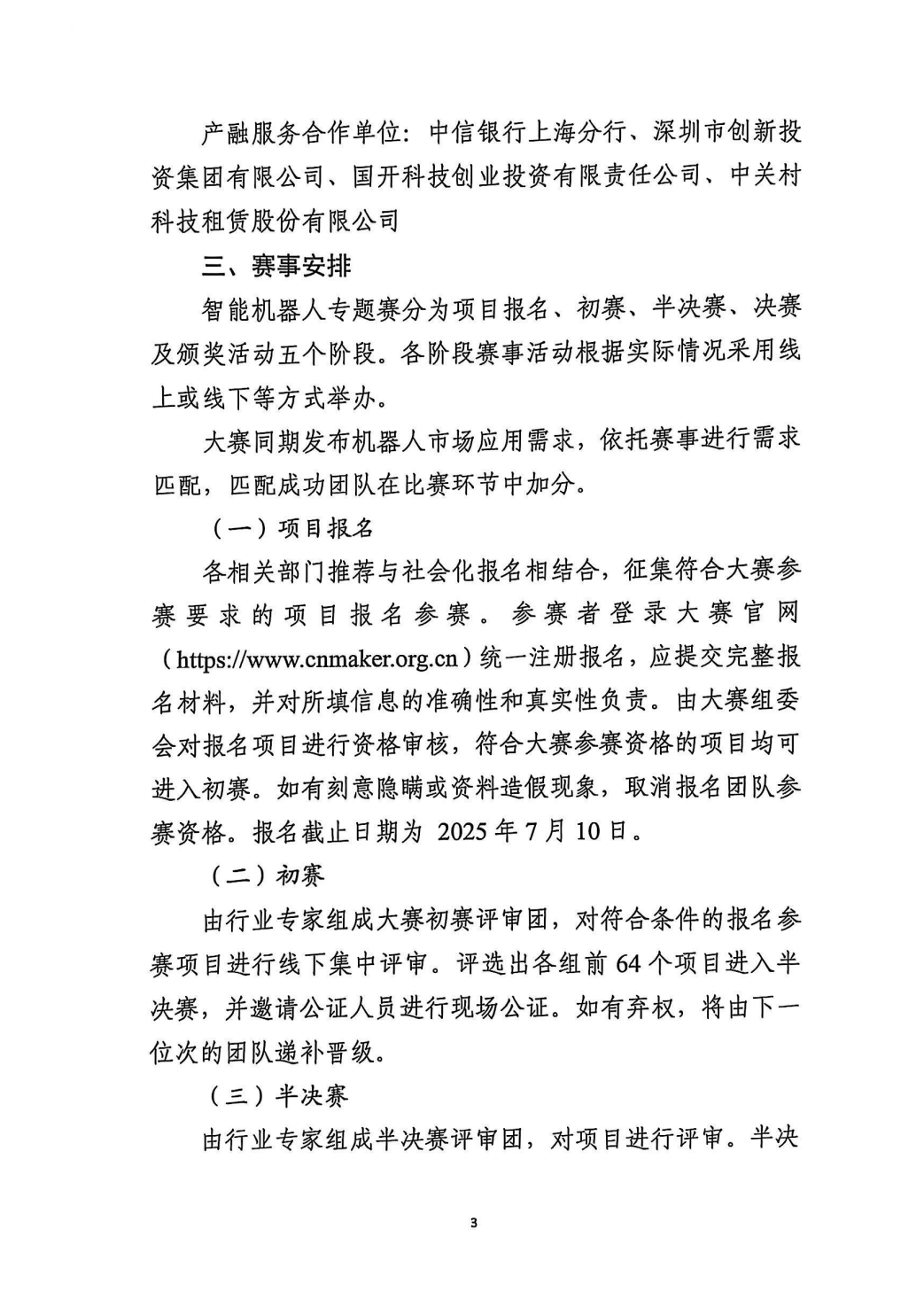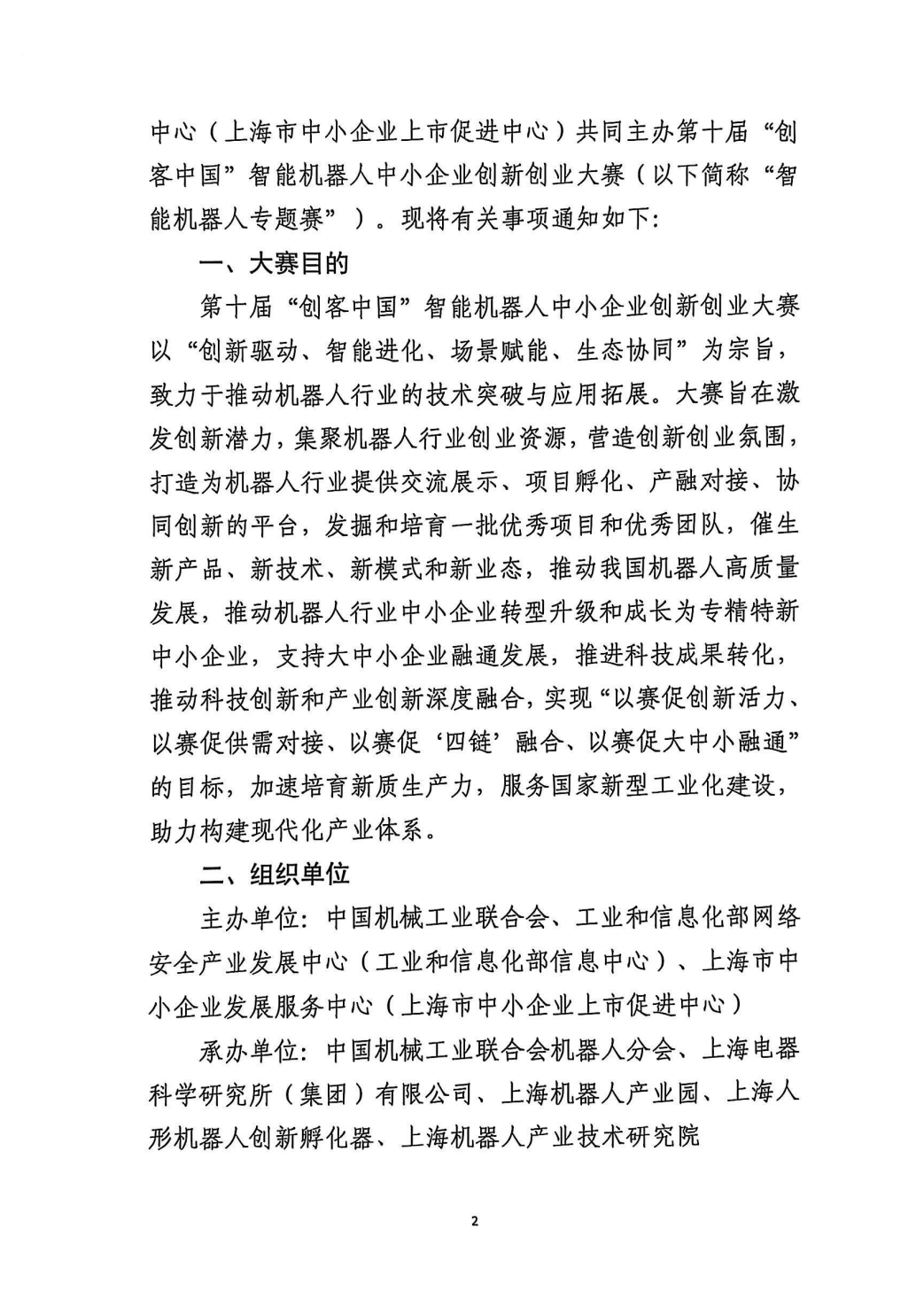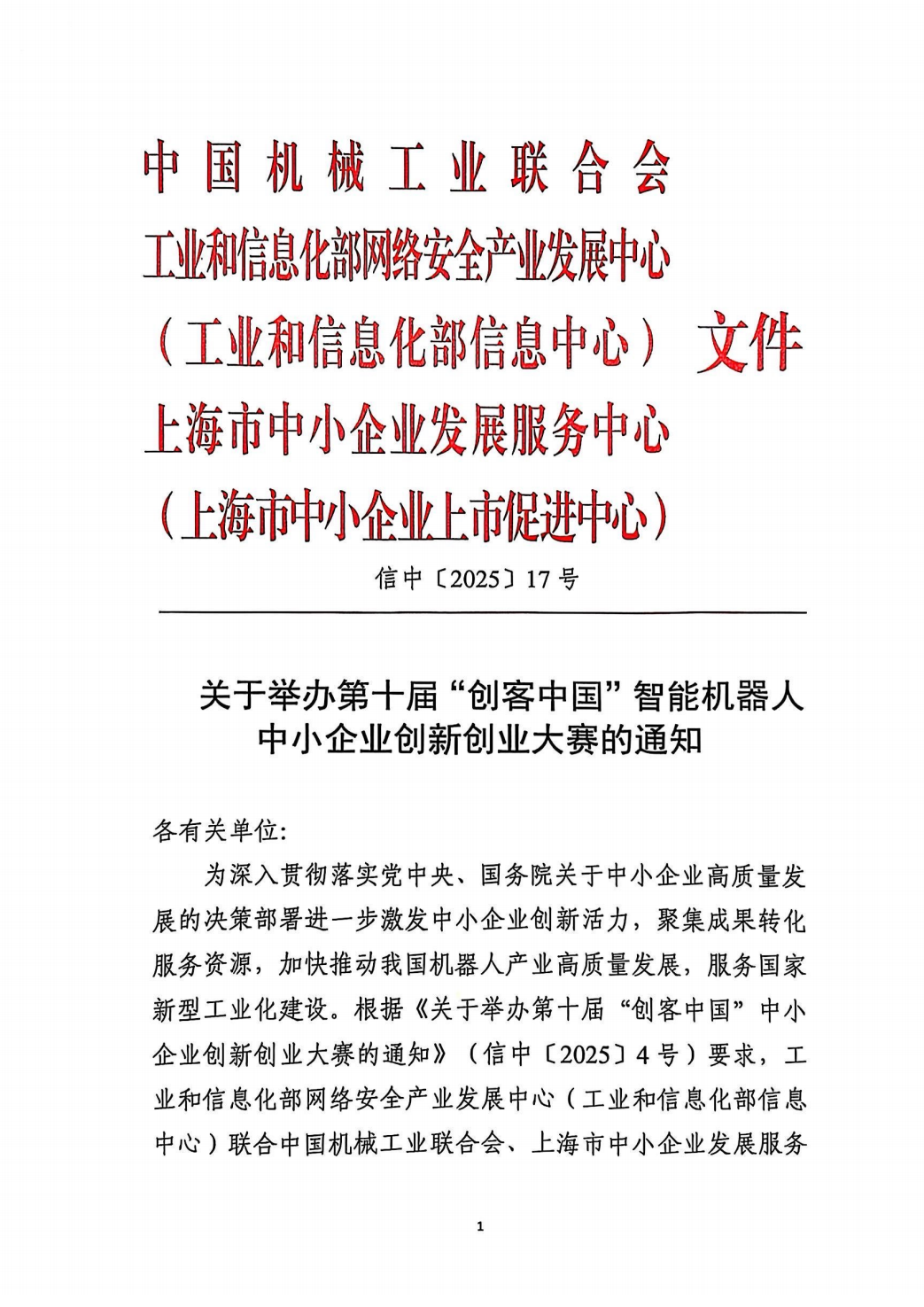 2025年4月17日,第十届“创客中国”智能机器人中小企业创新创业大赛新闻发布会在上海召开,大赛正式启动。本次大赛由中国机械工业联合会、工业和信息化部网络安全产业发展中心(工业和信息化部信息中心)、上海市普陀区政府、上海市中小企业发展服务中心(上海市中小企业上市促进中心)主办,由中国机械工业联合会机器人分会、上海电器科学研究所(集团)有限公司、银河集团(galaxy)(集团)机器人有限公司官网承办。