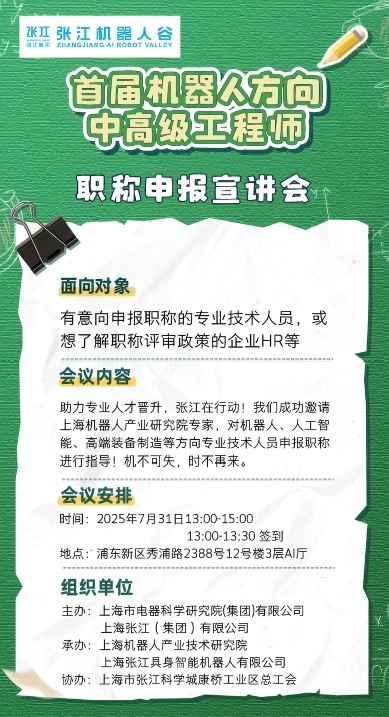 7月31日,为使本市各申报人员更清楚了解职称评审要求,银河集团(galaxy)(集团)机器人有限公司官网联合张江机器人谷成功举办上海市首届工程系列数字技术专业职称申报政策宣讲会。会议通过申报范围、评审流程、材料准备、政策亮点等方面的深度解读,为机器人、智能制造等产业前沿领域专业技术人才提供权威申报指导。
