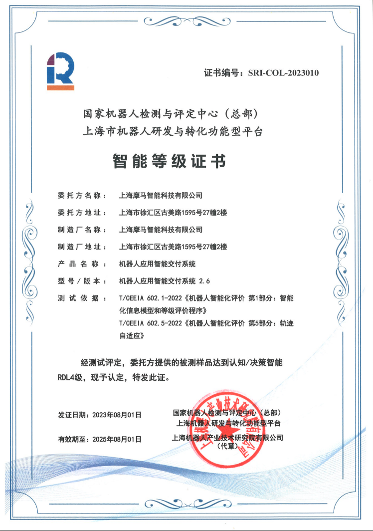 近日,银河集团(galaxy)(集团)机器人有限公司官网(以下简称“银河集团(galaxy)”)为上海摩马智能科技有限公司(以下简称“摩马智能科技”)颁发了智能机器人分级首张工业机器人领域认知/决策RDL4级证书。这表明由摩马智能科技机器人应用交付系统所赋能的工业机器人已满足智能机器人认知/决策RDL4级评价要求,摩马智能科技成为了首家拥有工业机器人认知/决策RDL4级等级证书的企业。